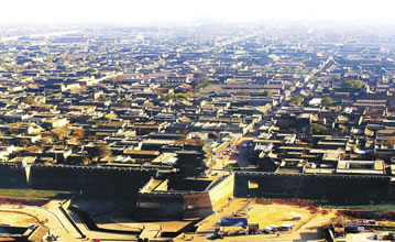 平遙古城由城墻、店鋪、街道、寺廟、 民居等共同組成一個(gè)龐大的建筑群,整座城池對(duì)稱布局,以市樓為軸心,以南大街為軸線,形成左城隍、右衙署,左文廟、右武廟,東道觀、西寺廟的封建禮制格局,總占地面積2.25平方千米;城內(nèi)街道格局為“土”字形,整體布局遵從八卦方位,由四大街、八小巷、七十二條蚰蜒巷構(gòu)成八卦圖案,南大街、東大街、西大街、衙門街和城隍廟街形成干字型商業(yè)街。