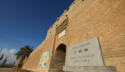 廣武古城分東、西、南三門,不設北門,街巷格局方正。坐落在山陰縣西南、雁門關外古長城腳下。隸屬于山西省朔州市山陰縣張家莊鄉(xiāng)舊廣武村。