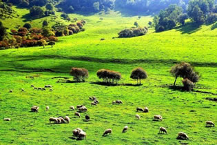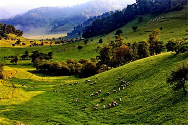 群山競秀,溪壑密布,林木參天,草場綿延不絕。森林沿圓潤柔和的山體從上到下呈放射狀分布,與廣闊肥腴的草原相間,形成了獨特的地理形態(tài)。組成草原的山巒重重疊疊,蜿蜒起伏,和舒緩寬闊的山谷坡地密切銜接,延綿不斷。幽澗水澤穿行于腹地,或囤積成片分布在大大小小的草坡上,或森林間,使得草原地面表層常年濕潤無比。春秋季節(jié),游人絡繹不絕的蜂擁而至,踩在青翠碧綠的草面上,常會為被地表的柔軟和從鞋子周圍緩緩溢出的水感到驚訝。由于受垂直地帶性地理條件的影響,終年氣溫較低,春秋相連,冬長無夏,素有“關山六月猶凝霜”的寫照。因其地貌酷似中歐的阿爾卑斯山,故有些旅游資料上稱其是“具有歐式風情的游覽勝地”。