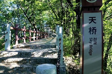 云霧天橋是由泥土和山石天然堆砌生就而成的。它坐落在云霧山鬼谷嶺南麓一條山脊上,地處三天門到四天門之間。這里海拔近2000米,在天際的白云中飄浮,所以稱它為云霧天橋。此橋其實就是一條短短的山脊,長約20余米,寬不足1米,僅容一人通過。