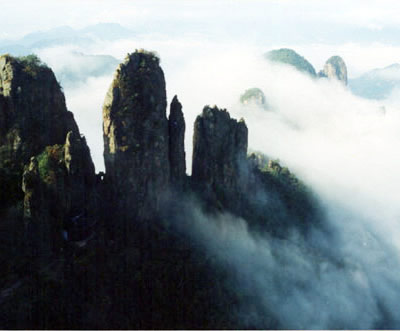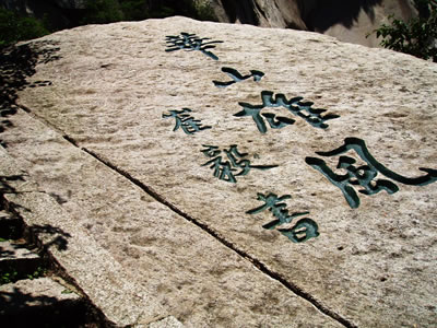 東峰頂生滿巨檜喬松,濃蔭蔽日,環(huán)境非常清幽。游人自松林間穿行,上有團才綠蔭,如傘如蓋,耳畔陣陣松濤,如吟如詠,頓覺心曠神怡,超然物外。明書畫家王履在《東峰記》中談他的體會說:高大的檜松蔭蔽峰頂,樹下石徑清爽幽靜,風穿林間,松濤涌動更添一段音樂般的韻致,其節(jié)律,此起彼伏,好象吹彈絲竹,敲擊金石,多么美妙啊。