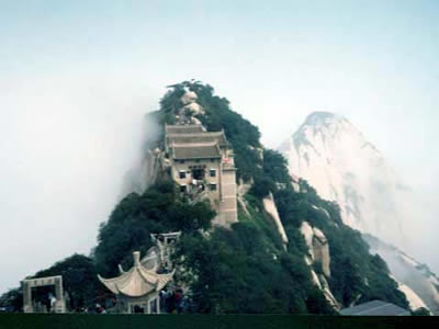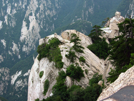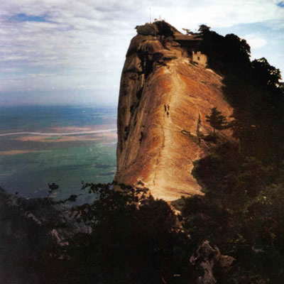 中峰居東、西、南三峰中央,是依附在東峰西側的一座小峰,古時曾把它算作東峰的一部分,今人將它列為華山主峰之一。峰上林木蔥蘢,環(huán)境清幽,奇花異草多不知名,游人穿行其中,香浥禁袖。峰頭有道舍名玉女祠,傳說是春秋時秦穆公女弄玉的修身之地,因此峰又被稱為玉女峰。