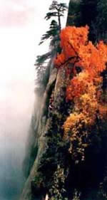 峰南側是千丈絕壁,直立如削,下臨一斷層深壑,同三公山、三鳳山隔絕。南峰由一峰二頂組成,東側一頂叫松檜峰,西側一頂叫落雁峰,也有說南峰由三頂組成,把落雁峰之西的孝子峰也算在其內。這樣一來,落雁峰最高居中,松檜峰居東,孝子峰居西,整體形象一把圈椅,三個峰頂恰似一尊面北而坐的巨人。明朝人袁宏道在他的《華山記》一書中記述南峰形象說:“如人危坐而引雙膝。”