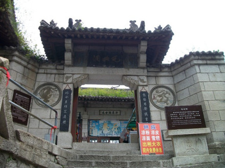 “通天亭”,因和山頂金鎖關通天門遙遙相對,所以叫“通天亭”,從這兒出玉泉院,“自古華山一條路”就從大家腳下開始沿伸,全長25華里,共有9567個臺階,沿途各位可以看到迷人的風光山色,誘人的驚險神道。