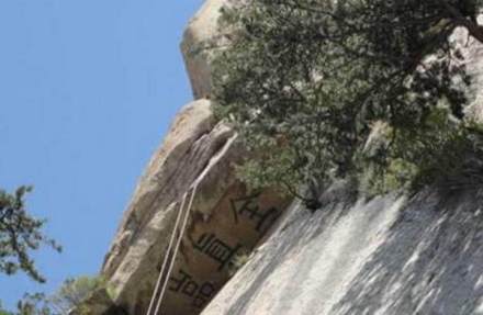 關于全真巖各類史志書籍記載頗多!度艌D會》載:“靜室旁有巖,高數(shù)十丈,遙覆其室,并書‘全真巖’三字!薄度A岳圖經(jīng)》中記述,全真巖三字每字大約七八尺高,鐫刻在那樣一個地方,除過能騰云駕霧的神仙,凡夫俗子肯定是辦不到的。明書畫大家王履的《南峰記》中記述得列為形象:巖好像一個彎腰人的頭部,遠遠遮蓋住腹部的石室。倒坎巖頂端鐫“全真巖”三字,并涂以紅色。世上沒有神仙,刻字肯定是人類所為,但在這樣特殊的位置,上不可上,下不可下,除非懸浮于空中才能可能。古人是如何做到這一點,迄今無解。