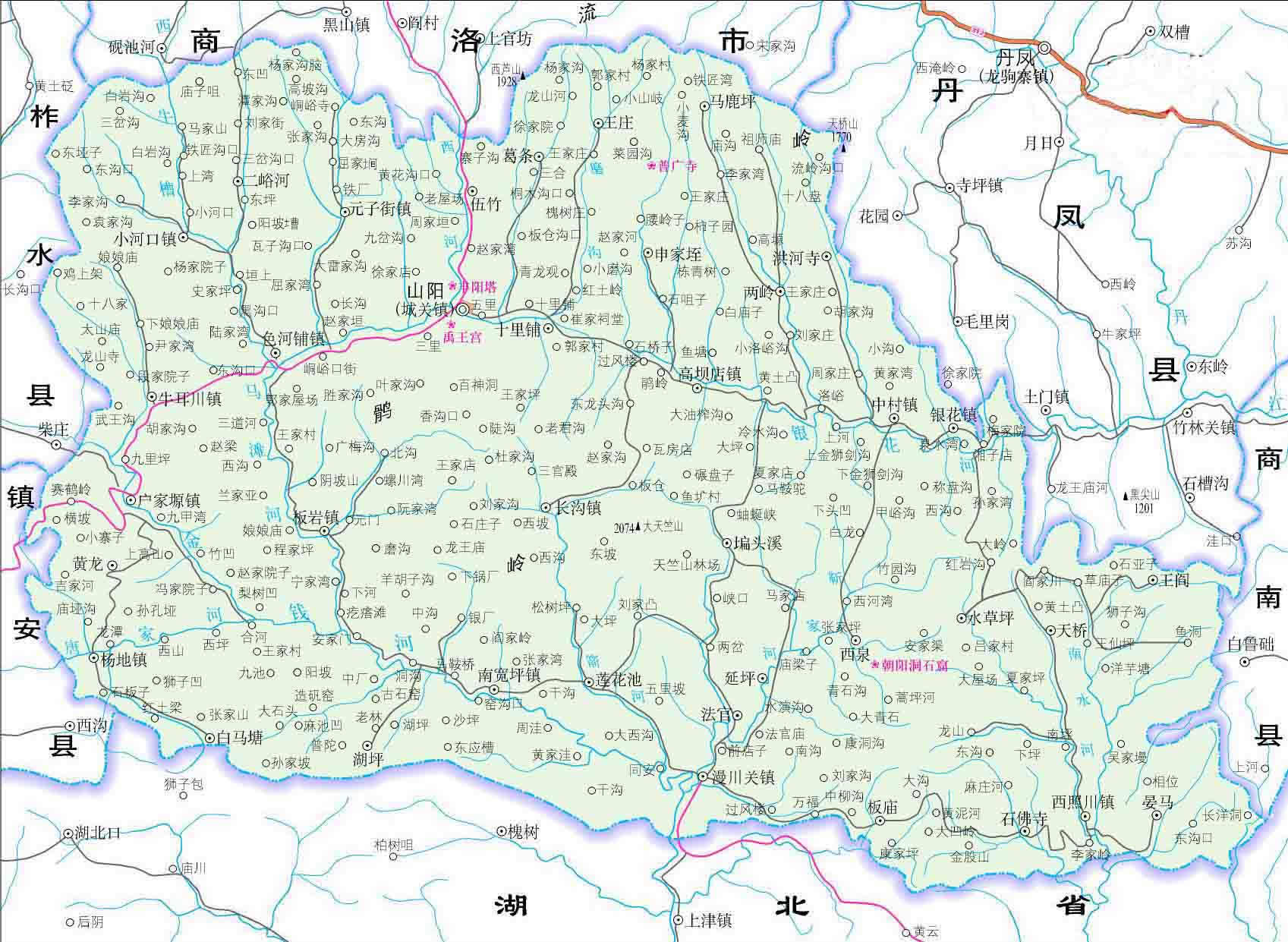 鎮(zhèn):城關(guān)鎮(zhèn)、高壩鎮(zhèn)、長溝鎮(zhèn)、中村鎮(zhèn)、銀花鎮(zhèn)、西照川鎮(zhèn) 、漫川關(guān)鎮(zhèn)、南寬坪鎮(zhèn)、戶家垣鎮(zhèn)、楊地鎮(zhèn)、牛耳川鎮(zhèn)、小河口鎮(zhèn)、色河鋪鎮(zhèn)、板巖鎮(zhèn)、元子街鎮(zhèn)