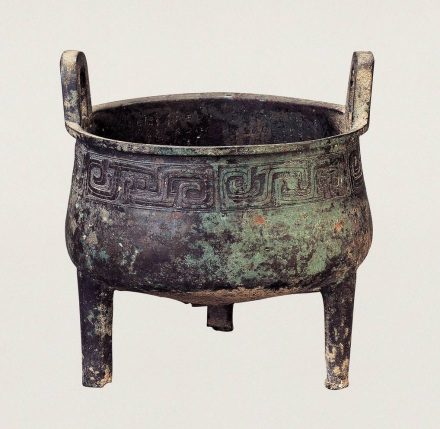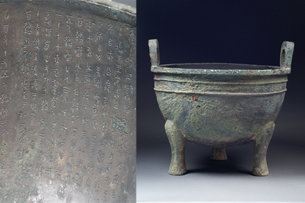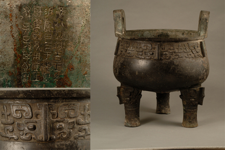 鑄于周康王時期,造型敦厚雄偉,紋飾莊重神奇。通高77厘米,口徑56.5厘米。立耳,深腹,平沿方唇,三柱足?谘叵嘛椄〉駹铟吟鸭y,地襯細雷紋。三足根部飾大饕餮面。雙耳外側(cè)各飾一條曲體上緣的夔龍。腹外壁及底部厚積煙跡,顯系長期使用所致。腹內(nèi)壁鑄有銘文28字。旟鼎承襲商代圓鼎風格,造型厚重莊嚴,紋飾十分精美,所刻銘文是研究周初土地制度的重要史料,具有珍貴的歷史及藝術(shù)價值,加之鑄刻時代明確,被公認為周康王時的標準器,是一尊著名的西周時期的國寶。
