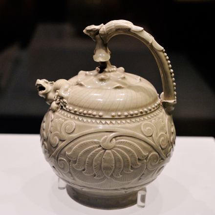 這件提梁倒灌壺是著名的耀州窯(窯址在今陜西省銅川市王益區(qū)黃堡鎮(zhèn))產(chǎn)品。耀州窯是唐宋時中國北方名窯,時人推崇耀瓷“巧如范金,精比琢玉”。此壺造型古樸典雅,制作規(guī)整精細,紋紋繁褥華麗,尤其是構(gòu)思奇特,設計巧奪天工,被認為是國內(nèi)外存世耀州窯瓷器中最為精美的一件。