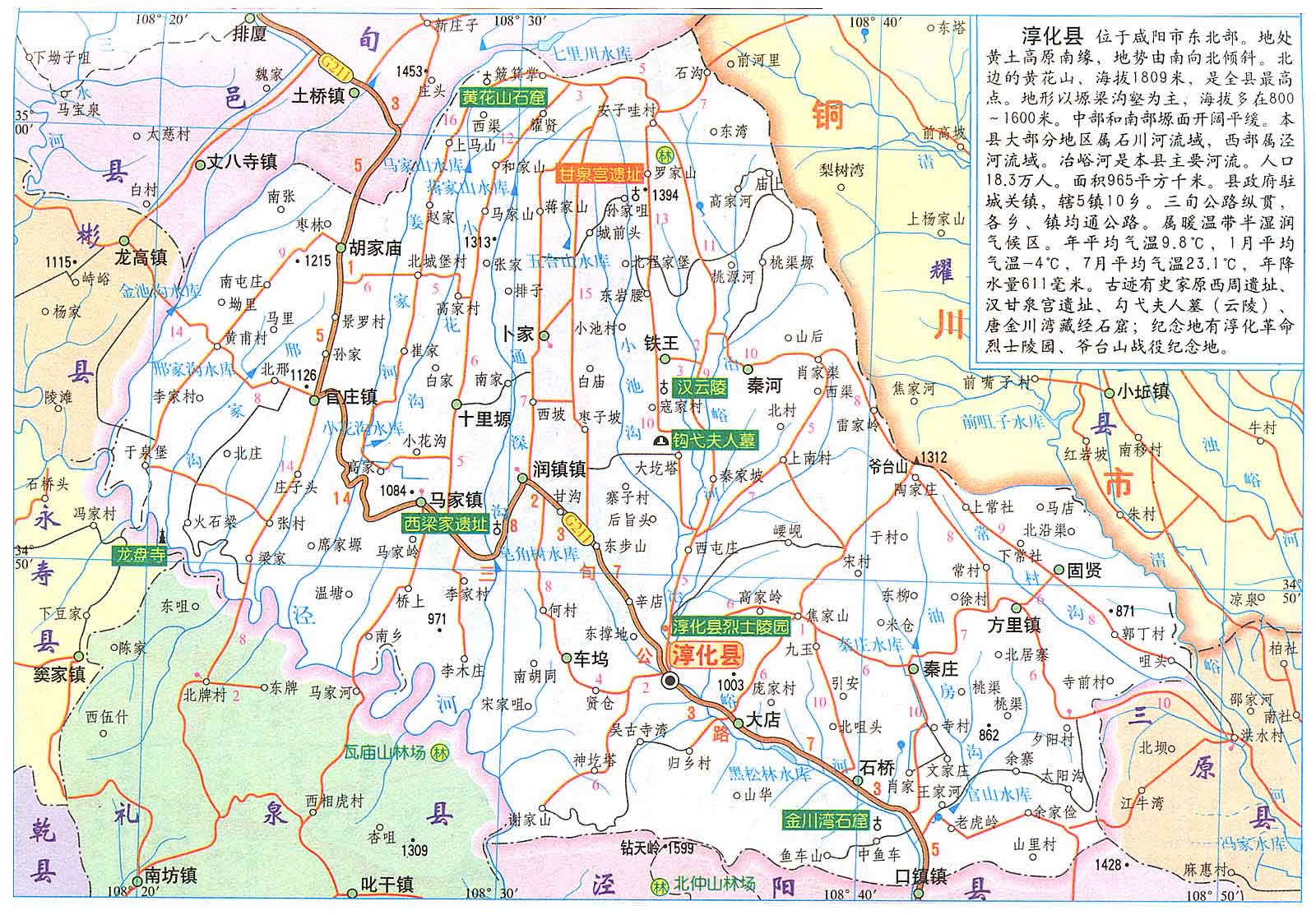 淳化縣以北宋太宗淳化年號而名。淳化縣位于三秦之腹,涇水之陽,南接北仲、嵯峨二山,北枕子午嶺余脈甘泉山(今黃花山),東依爺臺山,西鄰金池水。山圍水繞,盆抱而聚。冶峪蜿蜓貫其腹,涇水滔滔繞西南。是一個典型的山區(qū)農(nóng)業(yè)縣、革命老區(qū)縣和國家新一輪扶貧開發(fā)重點縣。全縣總面積983.81平方公里,耕地面積54萬畝,轄5鎮(zhèn)10鄉(xiāng)204個行政村,總?cè)丝?0.54萬人,其中農(nóng)業(yè)人口17.53萬人。境內(nèi)地勢北高南低,海拔630—1808.9米,地貌可概括為”一丘一山三溝五塬”。生態(tài)環(huán)境優(yōu)越,林草資源豐富,先后被評為“陜西省綠化模范縣”和“全國綠化模范縣”。傳統(tǒng)文化積淀深厚,民俗民風(fēng)淳樸,文物古跡眾多,秦直道、秦林光宮、漢甘泉宮、唐“三階教”石窟遺風(fēng)猶存。革命戰(zhàn)爭時期是陜甘寧邊區(qū)的南大門,鄧小平、劉志丹、習(xí)仲勛等老一輩無產(chǎn)階級革命曾在這里生活、戰(zhàn)斗過,震驚中外的爺臺山戰(zhàn)役就發(fā)生在這里。