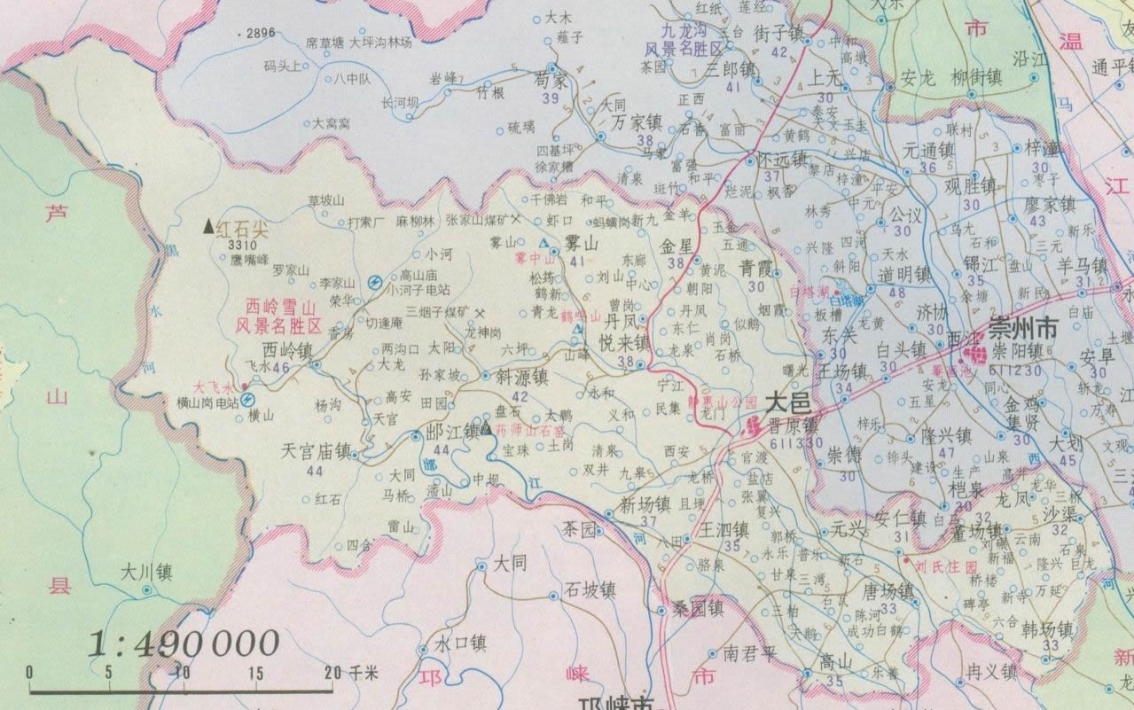 鎮(zhèn):晉原鎮(zhèn)、王泗鎮(zhèn)、出江鎮(zhèn)、西嶺鎮(zhèn)、斜源鎮(zhèn)、董場鎮(zhèn)、韓場鎮(zhèn)、三岔鎮(zhèn)、上安鎮(zhèn)、蘇家鎮(zhèn)、新場鎮(zhèn)、安仁鎮(zhèn)、悅來鎮(zhèn)、青霞鎮(zhèn)、沙渠鎮(zhèn)、蔡場鎮(zhèn)、花水灣鎮(zhèn)