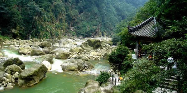 九龍溝:位于崇州市西北三郎鎮(zhèn),因“九溝九槽九條龍”的神話傳說而得名。這一地區(qū)為龍門山脈口段前斷裂帶,地質(zhì)構(gòu)造復(fù)雜,群山在海拔700米到3868米之間起伏變化,相對(duì)高差懸殊較大,懸崖陡峭,多飛瀑迭湍、深溝狹谷,有眾多的酷似龍形的奇峰怪石和飛瀑流泉。九龍溝內(nèi)水石相擊之聲如龍吟似龍嘯,巨石躺臥之狀如龍盤似龍睡,山峰聳立之形如龍騰似龍臥,簡直就是活生生的“人間龍宮”。崇州百姓中流傳有“九條龍從九龍池出游,在九龍山會(huì)合,回九龍溝安家,并在龍?zhí)蚴狭粝戮艤暇挪劬艞l龍”的神奇?zhèn)髡f。九龍溝景區(qū)面積175平方公里,其中游覽面積32平方公里,由九龍溝水石景區(qū)、大西山原始森林景區(qū)和古寺等三部分組成,以九龍溝動(dòng)態(tài)水石景觀最引人入勝,是風(fēng)景區(qū)的主要部分,有化石巖、珍珠泉龍石巖、龍女浣紗池、龍?zhí)蚴€@天峰、響水溝、九龍飛瀑等景觀,其中龍女融積雪而成的“九龍飛瀑”,寬10余米,高100余米,是成都地區(qū)不可多見的大瀑布。密林中隱藏著雄偉的古剎,是成都地區(qū)山林中保存較完好的規(guī)模較大的古廟。