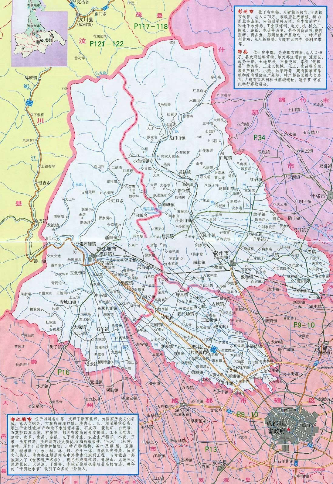 彭州市位于四川省會(huì)成都西北部,距成都市區(qū)25公里,人口78萬(wàn),面積1420平方公里,是成都市人口第三,面積第二的小康市。彭州是古蜀國(guó)建都立業(yè)的核心地區(qū),自秦漢以來(lái),建縣設(shè)郡達(dá)2000多年,有著悠久的歷史文明,素有“天府金盆”、“蜀漢名區(qū)”之美譽(yù)。