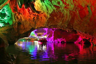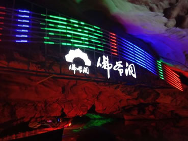 由南天門往右,沿著崎嶇的“盤陀路”進入第二殿,隨著“一柱廳”、“半天山”到達約有450平方米寬的“東海龍宮”那里“定海神針”直立,“五彩神泉池”水色清澈晶瑩,不寒而栗有“白龍越江奪寶”、“頑猴望”、“海獅戲蓮”、“別甲神鷹鎮(zhèn)金沙”、“龍王百寶箱”等天然造型,氣勢磅礴,極為壯觀。龍宮內(nèi)洞中有洞、景中有景。“武陵園”有牛角尖、簸箕天,海螺洞中有“鶴蚌相爭”、“海螺觀戰(zhàn)”、“鳴鑼助戰(zhàn)”、“石床”等石筍、鐘乳石造型,相映成趣,目不暇接。然而,“山有洞天不算奇,陰河劃船數(shù)第一”。沿著灣灣曲曲的跳蹬路,耳聽潺水聲,觀看“地海橫鯨”、“青蛙駝蓮”、“天地桃”、“美猴照鏡”等景點來到陰河劃船處——“凱旋門”、只見幽幽碧水,微泛漣漪,各種燈光倒映水中的燈景冉冉浮動。