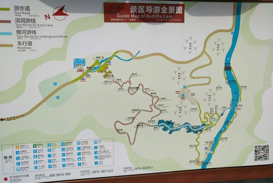 整個旅游區(qū)域以佛爺洞為主,其余的七仙洞、牛角洞、西方境等正逐步開發(fā)。佛爺洞由三廳、兩廊、一河構(gòu)成,全長三千余米,洞內(nèi)景點六十多個。全洞從上至下共分三層,第一層從“佛手迎客”至“南天門”。此層涼風(fēng)習(xí)習(xí),沁人心脾,滌蕩塵心。步入此層,迎面便是一只巨大佛手從洞頂伸出,歡迎你的到來。接著便是“三心堂”,所為三心及天心、地心、人心。還有“圣燈”、“金猴撈月”、“菩蒂樹”、“鯉躍觀柳”等栩栩如生的景點。行至前方,左有園盤皎陽,右有彎鉤銀月,名曰“日月門”。過此門沿石階面下,道旁有頭戴銀盔、身披鎧的“巨靈神”把守仙境要道。右方大廳石壁上一條巨蛇從洞內(nèi)伸頭欲奔,一只大龜頭頸長伸,狀若賽跑,對面石壁上老壽星美鬢長飄、笑容可掬觀看比賽,人們稱之為“龜蛇奔天門”。要道左方可觀看到:“雄獅騰空”、“千佛巖”、“達摩廊壁”、“靈芝山”、“神鷹回首”、“玉杯”、“金山、銀山”、“鋸臺”、“天橋”等惟妙惟肖的鐘乳石造型,恰似一幅璀燦奪目的藝術(shù)浮雕。