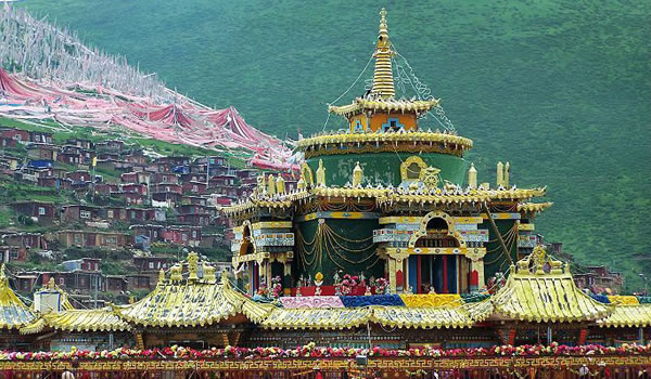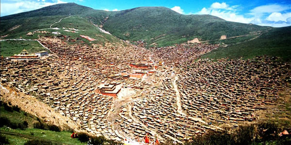 色達佛學(xué)院 距色達縣城20余公里處,有一條山溝叫喇榮溝,順溝上行數(shù)里,就是舉世聞名的喇榮寺五明佛學(xué)院,也稱色達佛學(xué)院。色達佛學(xué)院是世界上最大的藏傳佛學(xué)院之一。