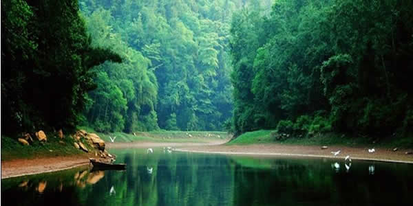 (4)象鼻河 象鼻河位于回龍湖尾段,經(jīng)岳池縣城出發(fā)車行至天平鎮(zhèn)回龍湖坐船可到,河長(zhǎng)約四公里。因河端有一小山,形態(tài)奇特,遠(yuǎn)望酷似大象的鼻子,所以這條河就叫象鼻河。象鼻河寬五六丈,象一顆長(zhǎng)寶石鑲嵌在兩岸的高巖之間。象鼻河西側(cè)有雞頸坳和庵堂坡相互攀比,各自把山巖泉水盡量拋出。飛瀑直下,銀花四濺,疑是仙人,丟下白練。兩岸樹木,青翠欲滴,藤繞山石,鳥戲其間,蜂飛蝶舞,何等悠然。乘舟慢進(jìn),有山風(fēng)習(xí)習(xí),涼爽撲面。清澈河水,擁抱船板,發(fā)出咕咕細(xì)語(yǔ),情意綿綿。上游涌來清流,與河水交融,握手言歡。游魚競(jìng)技,爭(zhēng)先恐后,其樂融融,游人贊嘆。“青山之中藏小河,木船水頭蕩清波。有人興起一聲吼,魚逃鳥飛野兔躲。誰(shuí)說人間無(wú)仙境?不信請(qǐng)來象鼻河。”象鼻河匯入的回龍湖鑲嵌在兩岸直壁芳草如茵的群山之中,這里水面遼闊,一碧如玉;湖上輕舟飛蕩,魚歌陣陣,銀鱗競(jìng)躍,水鳥爭(zhēng)翔,陰雨時(shí)山色空 蒙,晴天里滿目蒼翠,是川東的又一西子湖。湖邊近500畝的名優(yōu)水果和各種反季節(jié)果類,更是錦上添花。