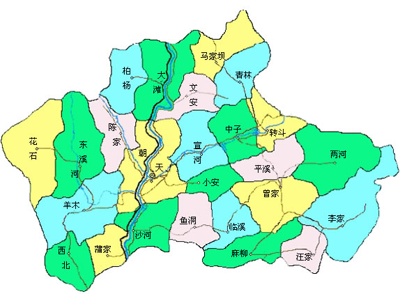 朝天區(qū)轄6個鎮(zhèn)、19個鄉(xiāng):朝天鎮(zhèn)、大灘鎮(zhèn)、羊木鎮(zhèn)、曾家鎮(zhèn)、中子鎮(zhèn)、沙河鎮(zhèn)、陳家鄉(xiāng)、小安鄉(xiāng)、魚洞鄉(xiāng)、東溪河鄉(xiāng)、花石鄉(xiāng)、蒲家鄉(xiāng)、西北鄉(xiāng)、宣河鄉(xiāng)、轉(zhuǎn)斗鄉(xiāng)、青林鄉(xiāng)、平溪鄉(xiāng)、兩河口鄉(xiāng)、李家鄉(xiāng)、汪家鄉(xiāng)、麻柳鄉(xiāng)、臨溪鄉(xiāng)、文安鄉(xiāng)、馬家壩鄉(xiāng)、柏楊鄉(xiāng)。