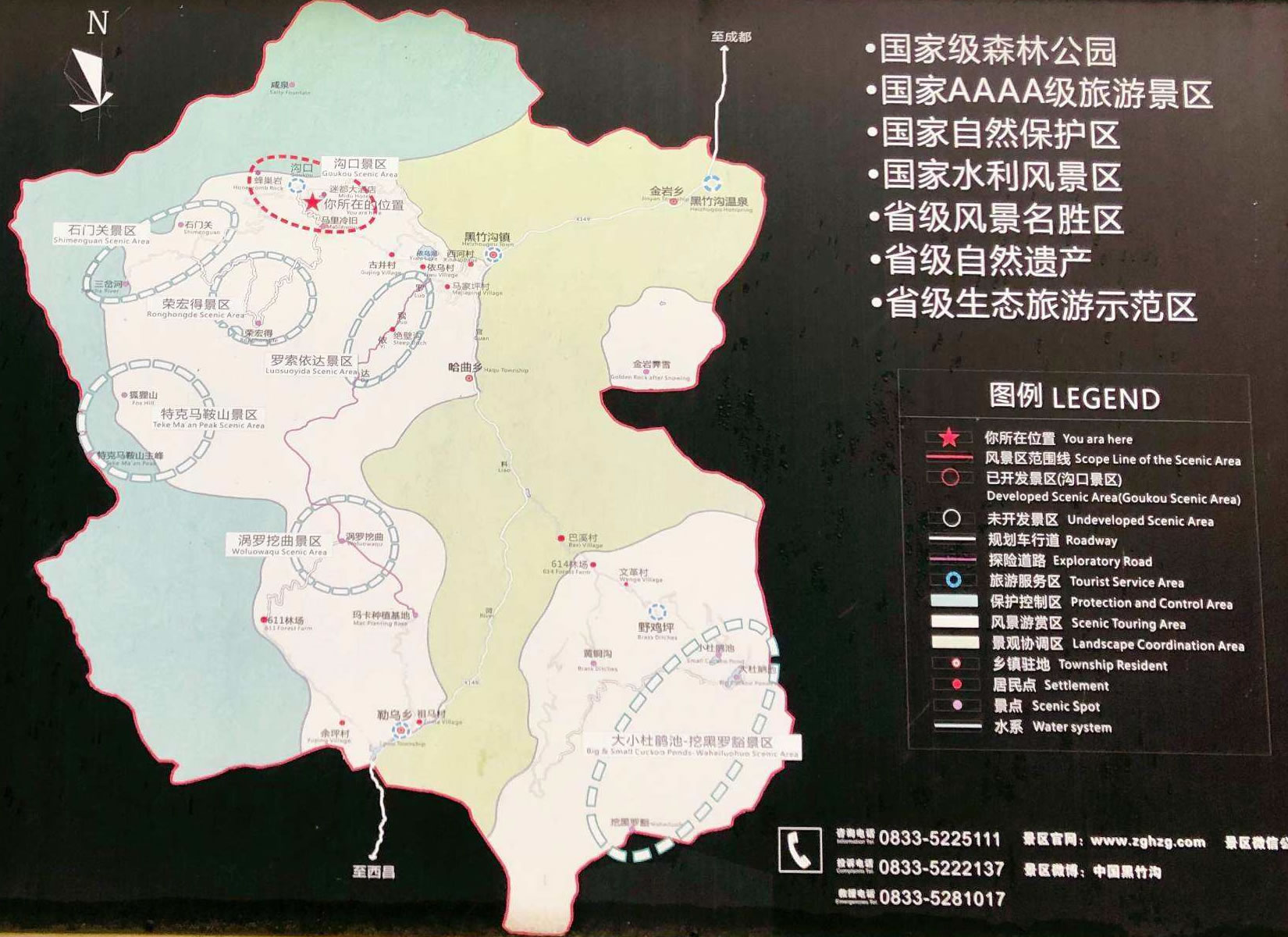景點有:杜鵑林海、狐貍山、金字塔、天然根雕盆景園、馬鞍山主峰、天眼、船湖、冰川遺址、杜鵑含 玉、神濤林、野人谷、佛光、云海、日照金山、高山草甸、狐貍坪、小石林、陰陽界、杜鵑瀑布、天眼瀑布等。