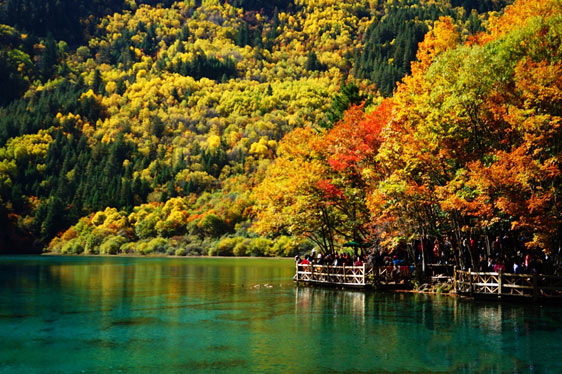 浪漫的秋風也吹來了九寨溝最為燦爛的時節(jié)。山林暈染成色,除了綠色以外,還呈現(xiàn)出金黃、火紅等色彩,五彩繽紛,倒映在明麗的湖水中,湖山同色,湖水也斑斕似錦了,一時間竟然不能分清哪里是山哪里是水,十分迷人。