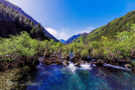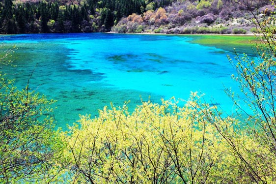 春風吹拂,沉睡的九寨溝蘇醒了。冰雪融化,新綠發(fā)芽,春水的顏色映著山色,嬌嫩得讓人不忍探視,仿佛只要輕輕地一口氣都能讓它消失。水邊道旁,鬧哄哄開滿了不知名的美麗山花,桃紅、絳紫、靚藍、鵝黃,繁華似錦,爛漫一路。溫柔而慵懶的春陽吻接湖面,愛撫春芽,也悸動了你久閉的心門......