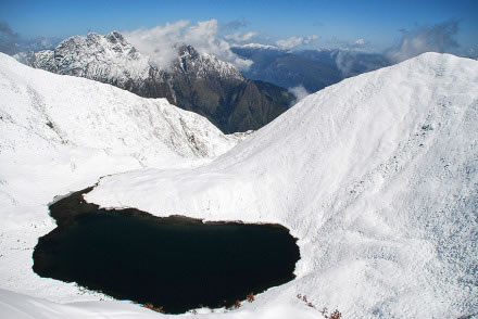 黑湖(黑海)藏名措拉,面積約5畝,深8米,這是相當深、相當?shù)湫偷囊粋冰斗湖遺跡。據(jù)資料所述,早年當?shù)夭孛裉旌登笥陼竭@個湖,湖上常年飄有低云,在下面大聲呼喊,上面的云就會落下雨滴。夏天的黑湖附近是一片草場,冬日雪景又是另外一番景觀。