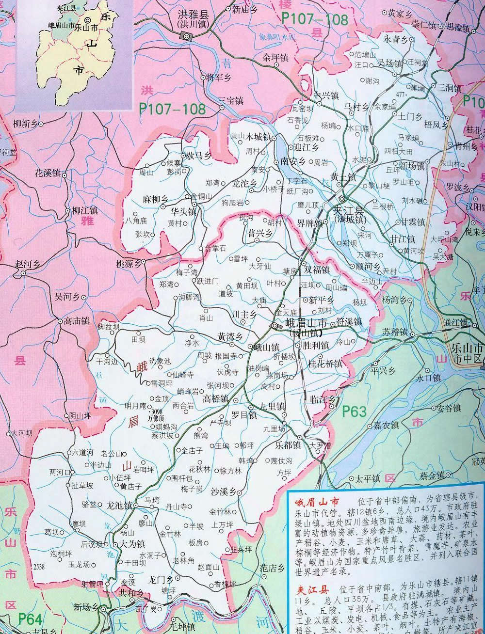 鎮(zhèn):綏山鎮(zhèn)、九里鎮(zhèn)、羅目鎮(zhèn)、龍池鎮(zhèn)、樂都鎮(zhèn)、峨山鎮(zhèn)、大為鎮(zhèn)、符溪鎮(zhèn)、雙福鎮(zhèn)、高橋鎮(zhèn)、桂花橋鎮(zhèn)、勝利鎮(zhèn)
