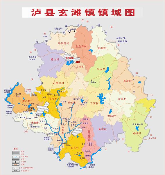 瀘縣玄灘鎮(zhèn)鎮(zhèn)域圖 行政區(qū)劃 瀘縣玄灘鎮(zhèn)幅員面積115平方公里,轄區(qū)內(nèi)人口9萬人,城鎮(zhèn)建成區(qū)面積2平方公里,常住人口2.2萬人。轄5個社區(qū)、20個行政村《正大街社區(qū)、東街社區(qū)、西街社區(qū)、中和社區(qū)、喻坪社區(qū) 》、《石鵝溝村、金龍寺村老油房村、通山村、石鵝溝村、玄豐村、新屋村、平安村、刁河村、黃坭村、涂場村、龍鳳村、涂豐村、易灣村 、太陽村、中心村、海羅村、玉石村、黃泥灘村、勞動村、朱和村》! 歷史沿革 1934年設(shè)玄灘鎮(zhèn),1937年改鄉(xiāng),1951年復(fù)建鎮(zhèn),1958年改公社,1992年再復(fù)鎮(zhèn)。1997年,面積74平方千米,人口5.6萬,轄龍鳳、飛躍、永紅、涂鋒、刁河、馮光、黃泥、同豐、黃林、新山、平安、光前、紅星、向?yàn)、易灣、斷石龍、新屋、蔣灣、金龍寺、新房子、玄鋒、高場、陳家咀、石鵝溝、通山、萬居所、桑壩、東風(fēng)、宋糟坊、瓦子壩、清油坊31個行政村和正大街、馬路街、半邊街、鹽聯(lián)街4個居委會。 2004年,面積78平方千米,轄31個村、4個社區(qū),總?cè)丝?7621人。集鎮(zhèn)建成區(qū)面積1.7平方千米,常住人口2.15萬人。 2006年,將原玉河鎮(zhèn)所屬行政區(qū)域并入玄灘鎮(zhèn)。玄灘鎮(zhèn)政府駐玄灘場。