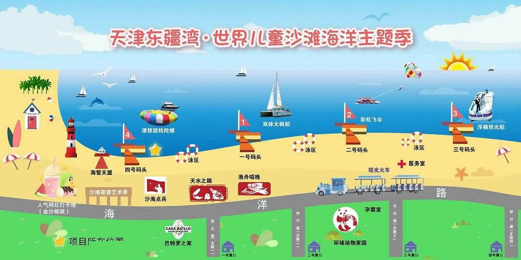 景區(qū)還將增添激情水上飛碟、快艇漂移、水上沙發(fā)、水上UU船、帆船、海上滑梯、海上蹺蹺板等數(shù)十項(xiàng)大型游樂設(shè)施,讓這里真正成為海上“迪士尼”。作為配套設(shè)施,在人工海灘西側(cè)修建濱海路,全長1.3公里,道路寬24米,為景區(qū)內(nèi)步行觀景道路,道路兩側(cè)綠化面積約6700平方米。綠化廣場總面積12萬平方米,景區(qū)停車場總面積約4700平方米。景區(qū)設(shè)置為沙灘親水區(qū)、沙灘游泳休閑區(qū)、水上運(yùn)動(dòng)休閑中心和水上休閑娛樂區(qū)。其中,位于沙灘游泳休閑區(qū)已經(jīng)建成的海景會(huì)所,是目前國內(nèi)北方最大的單體木結(jié)構(gòu)海景酒店會(huì)所,設(shè)有餐飲、住宿、淋浴、商務(wù)、娛樂等設(shè)施,并提供有地道的天津狗不理包子。另外,會(huì)所周邊正在建設(shè)游艇會(huì)所、五星級(jí)酒店、運(yùn)動(dòng)廣場、低密度住宅、高爾夫球場等設(shè)施。配套服務(wù)設(shè)施將逐步完善。