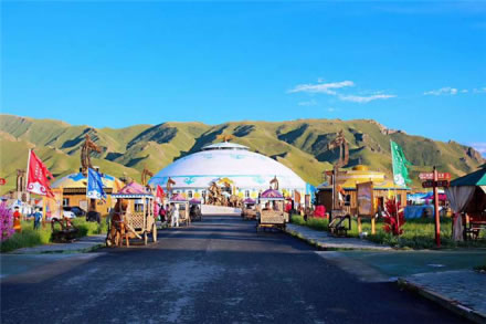 文化村是以當(dāng)?shù)赝翣栰杼厣钇鹁幼∷,以及一些生活中息息相關(guān)的物資修建而成,其中最引人注目的是中間最大的土爾扈特蒙古族汗帳。旅游季節(jié)在這里演藝大型舞臺實(shí)景劇《東歸印象》,該劇根據(jù)清乾隆三十六年(1771年)土爾扈特蒙古族克服重重艱難險(xiǎn)阻返回祖國懷抱的故事改編,該劇分《起義》《回家》《民族文化節(jié)日》三篇,演繹了東歸的過程和回歸后的幸福生活,演出場面宏大。當(dāng)?shù)氐哪撩,成百只馬匹、黑頭羊、牦牛、駱駝也參與演出,穿越時(shí)空,將東歸歷程中的愛情、親情、友情完整呈現(xiàn)。