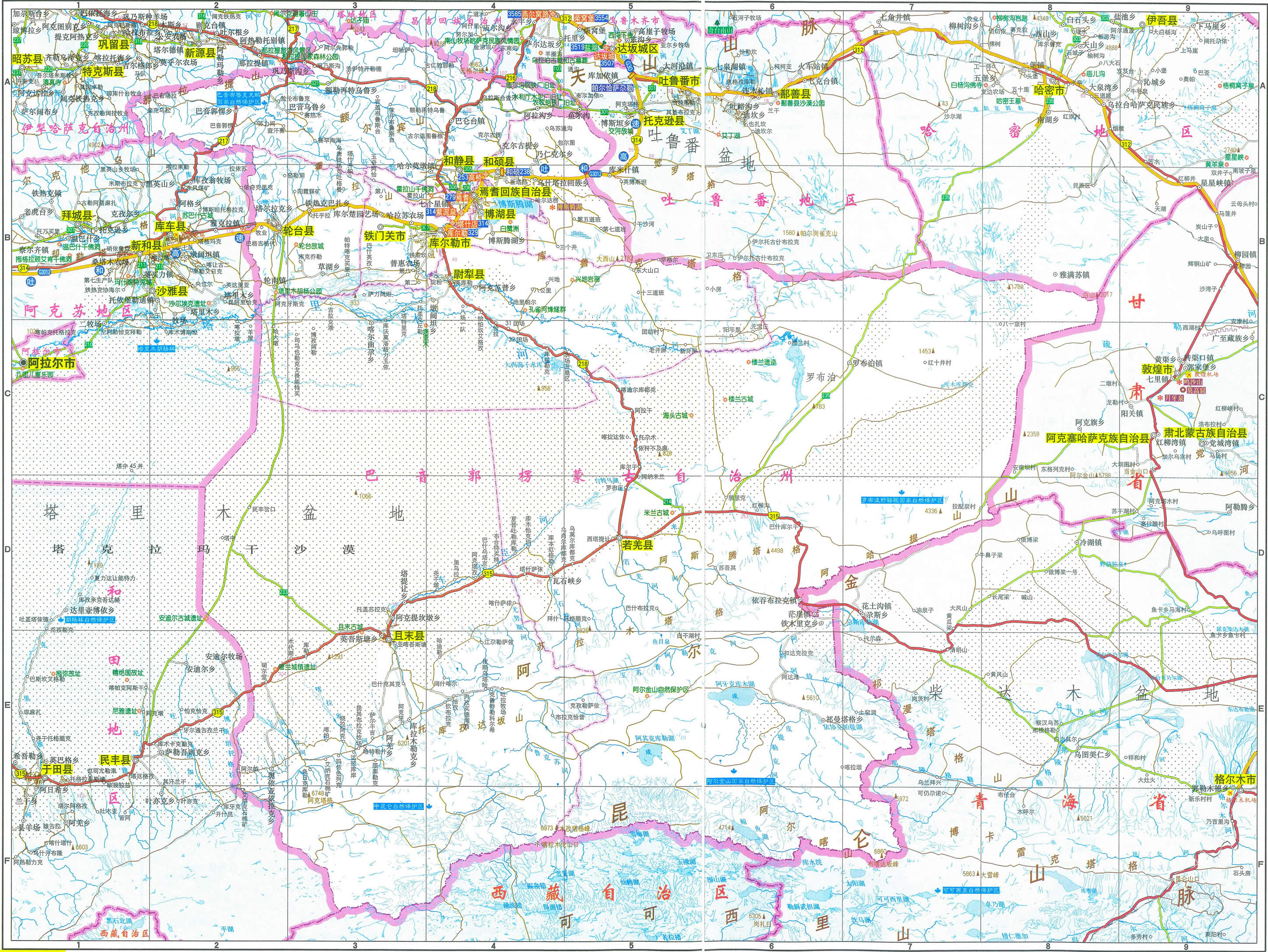 尉犁縣 面積59251平方千米,人口107487,政府駐尉犁鎮(zhèn),下轄3個(gè)鎮(zhèn)、5個(gè)鄉(xiāng)