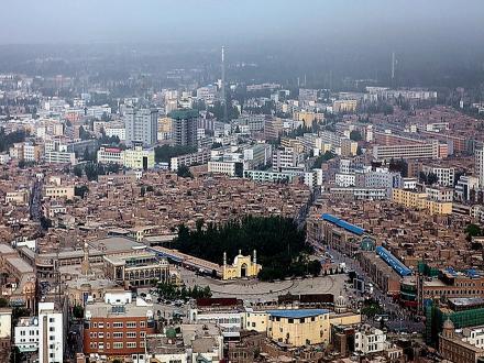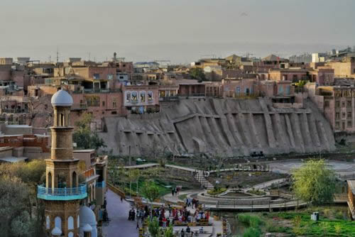 清朝自1760年在喀什噶爾設(shè)參贊大臣之后,作為天山以南的政治、經(jīng)濟、文化和交通中心,喀什噶爾城人口激增,舊城區(qū)居住不下,開始向今解放路以西拓展。1762年筑徠寧城,與舊城只隔不足1公里。到1839年,徠寧城與舊城之間的地帶已全建為民居,清朝駐喀什噶爾阿奇木伯克郡王祖赫爾。词窌兴Q“阿肯木伯克早敦”)主持了擴城工程,將城西墻移至今尤木拉克協(xié)海爾路,與原徠寧城相連,在今老郵電局處新辟南門,稱“庫木代爾瓦扎”(沙門),南關(guān)一帶成為繁華的手工業(yè)區(qū),形成了以艾提尕大清真寺為中心的一座新城。