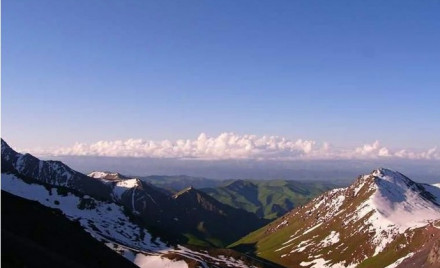 登山大營(yíng):在草甸草原自然景觀區(qū)和其上的高山礫漠自然景觀區(qū)的交接地帶,海拔為3540米,登博格達(dá)峰的大本營(yíng)就設(shè)在這里。從天池南岸到大本營(yíng),登山者一般走下面兩條路:一是沿大東溝向東折南翻過“三個(gè)岔達(dá)坂”,這條路較為平緩;一是向南折東沿將軍溝翻過“以肯起達(dá)坂”,這條路則較為陡峭。兩條路的全程分別為25公里和30公里。