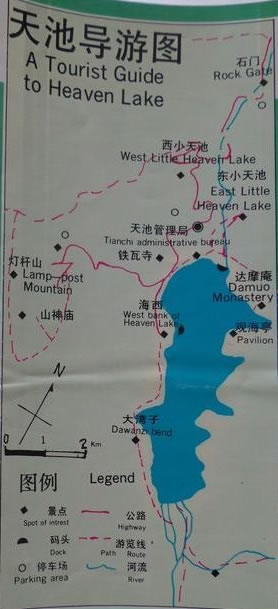 燈桿山(禪燈山):海拔2718米,在距大天池西岸約4公里處(一說三公里),山體呈南北走向,長(zhǎng)3公里許,寬約2公里,可游面積0.2平方公里,是天池西側(cè)群峰第二高峰,屬中山峽谷森林帶;山上有大片牧場(chǎng),老君廟、東岳廟均建于此,過去曾有道士在山頂立一上掛天燈的松桿,晝夜不滅預(yù)示世道太平,又稱太平燈;燈桿山是極佳的觀景地,上可遙望博格達(dá)雪峰、下可俯瞰天池全貌,“西山觀松”和觀看日落等也是絕佳的位置;由此西眺,烏魯木齊可盡收眼底,尤其在夜晚華燈初上之際,可遠(yuǎn)觀烏魯木齊萬家燈火。相傳這座山上立的上掛“天燈”的松桿是人們?yōu)榱思o(jì)念菩提達(dá)摩在對(duì)面的“達(dá)摩禪洞”里思考和所傳的禪法。循大天池西側(cè)盤山公路向上數(shù)百米,見路邊“新疆瑤池國(guó)際旅行社中國(guó)天山天池馬克·鐘度假村”(內(nèi)有絲綢古道馬克鐘餐飲廣場(chǎng)等),再向上約3公里便可到達(dá)。