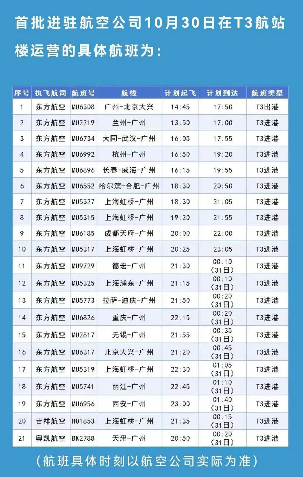 10月31日起,東方航空、上海航空、中國聯(lián)合航空、吉祥航空、奧凱航空的國內(nèi)進(jìn)出港航班均調(diào)整至白云機(jī)場(chǎng)T3航站樓運(yùn)營,東方航空的國際航班暫保留在T1航站樓運(yùn)營。