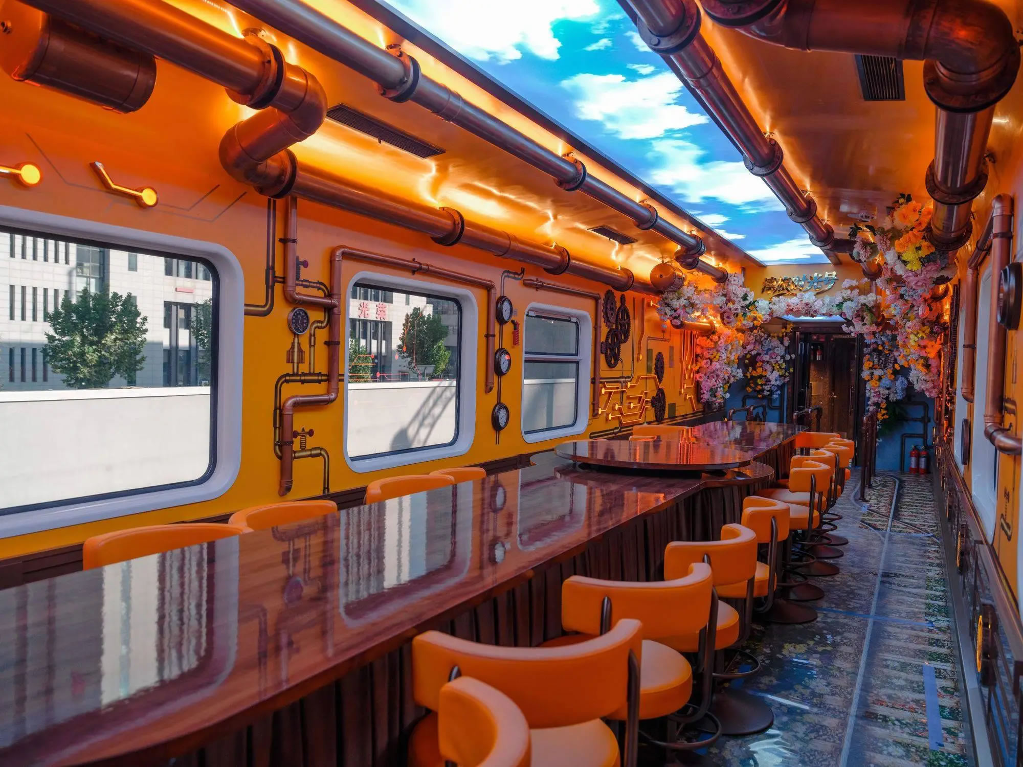 列車共設(shè)10節(jié)主題鮮明的特色車廂:分別為復(fù)古客座車廂、蒙太奇幻境互動演藝車廂、珍奇花園俱樂部車廂、沉浸式時(shí)空穿梭機(jī)車廂以及專屬VIP車廂,均以沉浸式戲劇化空間為理念,將座椅拆分重組,每節(jié)車廂形成互動或演藝區(qū),配備移動舞臺、隱藏?zé)糗壓铜h(huán)繞音響。座椅、地面及軟裝材料兼顧安全與舒適,同時(shí)配備冷暖氣系統(tǒng)、移動吧臺和多功能儲物柜,提供全方位的互動體驗(yàn)。