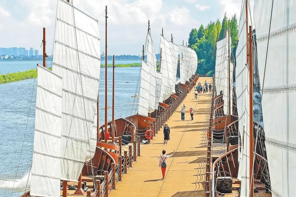 近日,昆明滇池綠道環(huán)草海段鋼浮橋重新向公眾開放。該橋是我省首座大型鋼浮橋,全長260米,以24組“帆船”造型藝術(shù)化再現(xiàn)“百舸爭流、千帆競發(fā)”的滇池古渡意象。該浮橋在2023年建成后曾對(duì)公眾開放過一段時(shí)間,后處于封閉狀態(tài)。此次重新開放,讓市民游客得以完整體驗(yàn)環(huán)滇池的自然風(fēng)光與人文景觀。圖為市民游客在鋼浮橋游覽。(記者 胡妤雅)