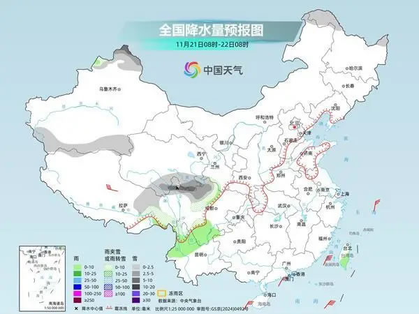 具體來看,中央氣象臺(tái)預(yù)計(jì),今天,新疆北疆北部、黑龍江西北部、西藏東部、青海南部、川西高原北部等地部分地區(qū)有小雪或雨夾雪,其中,新疆北疆阿勒泰山區(qū)、青海東南部、川西高原北部等地部分地區(qū)有中到大雪。四川南部、云南北部、臺(tái)灣島東部等地部分地區(qū)有小雨。