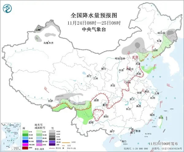 中國天氣網(wǎng)訊 進(jìn)入11月下旬,影響我國的冷空氣較為頻繁。目前,一股較強(qiáng)冷空氣正自西向東影響我國,今明天(11月24日至25日),冷空氣繼續(xù)東移南下,東北、華北東部到華南等地都將出現(xiàn)降溫。緊接著,25日至27日,又將有新一股冷空氣影響我國。此外,我國西南地區(qū)、東北等地雨雪天氣頻繁,局地或現(xiàn)大雪。