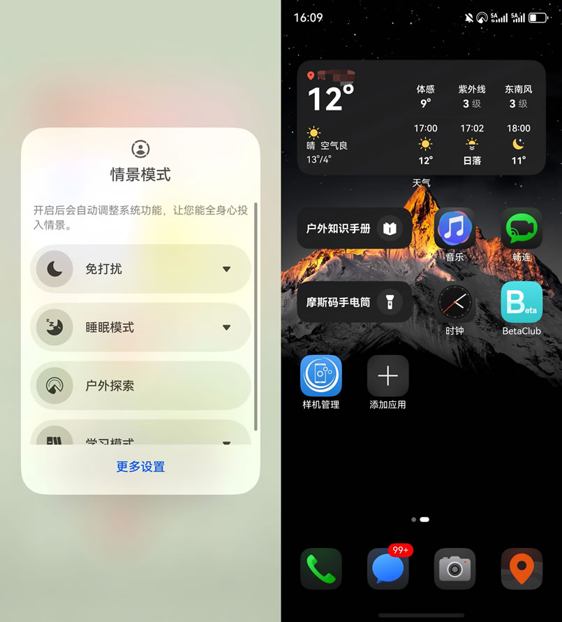除此之外,我還留意到一個很貼心的設(shè)計(jì):開啟戶外探索模式后,桌面上的天氣時鐘組件會自動切換成“戶外版”——字體變得粗大清晰。在戶外徒步中,只需瞥一眼屏幕,快速知曉時間、氣溫等。