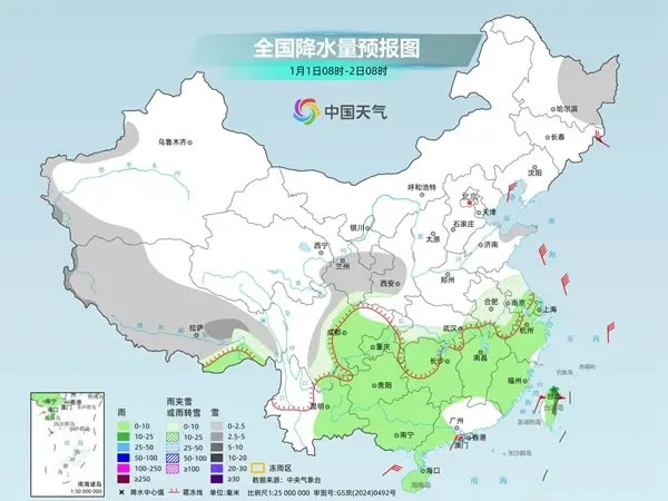 除了降溫,冷空氣還將帶來大范圍雨雪天氣。隨著冷空氣南下與暖濕氣流交匯,今天至2026年1月1日,中東部將現(xiàn)大范圍雨雪,陜西中南部、山西南部、河南西部、湖北西部部分高海拔地區(qū)有大雪或暴雪,最強(qiáng)降雪時段為2025年12月31日至2026年1月1日早晨。
