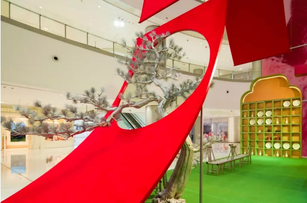 山水,并非遠(yuǎn)行才可得見。書法水墨藝術(shù)家劉玥首展作品《春山行遠(yuǎn)圖》以20米巨幅“山水開卷”,步入其中,與天地春意從容照面;紅色的帷幔落于銀色的松枝上,就像于山間松下靜謐的一隅,“幕下棲心”將是絕佳開年時尚大片的打卡處;松下銀椅,為你與摯友“漫敘往來”的相聚時刻營造出寧靜、松弛的氛圍;多寶閣中陳列著未經(jīng)雕琢的茶器素胚與場內(nèi)品牌萬仟堂,長沙尼依格羅酒店及tea'stone帶來的新春茶器,以“初芒蘊(yùn)能”詮釋著未來的無限可能與新生力量。轉(zhuǎn)身與“蒔光種愿” 四方亭相遇。葫蘆門朝四方而開,寓意著納四方福祿,步入其中,與數(shù)字交互藝術(shù)家吳旭首展作品《無限福祿》體驗(yàn)互動,跟隨指引揮動手勢,觸發(fā)粒子凝聚為動態(tài)“福”字,親手完成一場新春祈福儀式。我們把象征團(tuán)圓與喜悅的紅色沙發(fā)打造“盞間聚暖”,如懷抱般圍合的布局作為“歸處”的隱喻。與家人團(tuán)聚便是心歸處,這將是中國年最圓滿的意象。