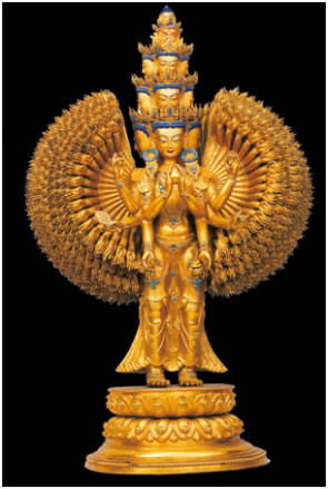 西藏本土制造的宗教文物,以金銅造像最著名。羅布林卡興建之初,七世達(dá)賴(lài)為給剛建好的宮殿佛堂添裝佛像及佛教用具,曾在布達(dá)拉宮腳下建立了一所名為“雪堆白”的造像場(chǎng),匯集了藏區(qū)內(nèi)幾百名能工巧匠,在這里精心打造各種佛像器物,以滿(mǎn)足拉薩及周邊地區(qū)寺院的需求。羅布林卡從初建到最后完善,每座佛堂里的大小佛像都被指定由“雪堆白”工匠量身定做打造。除此之外,園內(nèi)很多佛龕、宗教用具、金頂屋檐、門(mén)楣雕飾等,也都出自“雪堆白”工匠之手!把┒寻住痹煜裉攸c(diǎn)是制作精細(xì)、比例勻稱(chēng)、色彩鮮明艷麗,佛像上的鍍金厚重,鍍金面光潔度高,佛冠、耳墜、臂釧、手鐲、飄帶等飾物,一律用綠松石鑲嵌。這些明顯特征,說(shuō)明18世紀(jì)中葉以后,西藏本土佛像打造技術(shù)已步入了獨(dú)立發(fā)展的成熟階段。