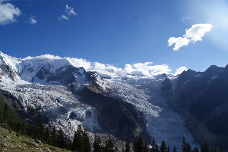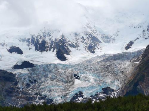 該冰川常年雪光閃耀,景色神奇迷人。這是典型的現(xiàn)代季風(fēng)型溫性冰川,類(lèi)型齊全,尤以巨大的冰盆、眾多雪崩、陡峭巨大700-800米的冰瀑布、消融區(qū)上游的冰面弧拱構(gòu)造以及冰川末端冰湖和農(nóng)田、村莊共存為特點(diǎn)。