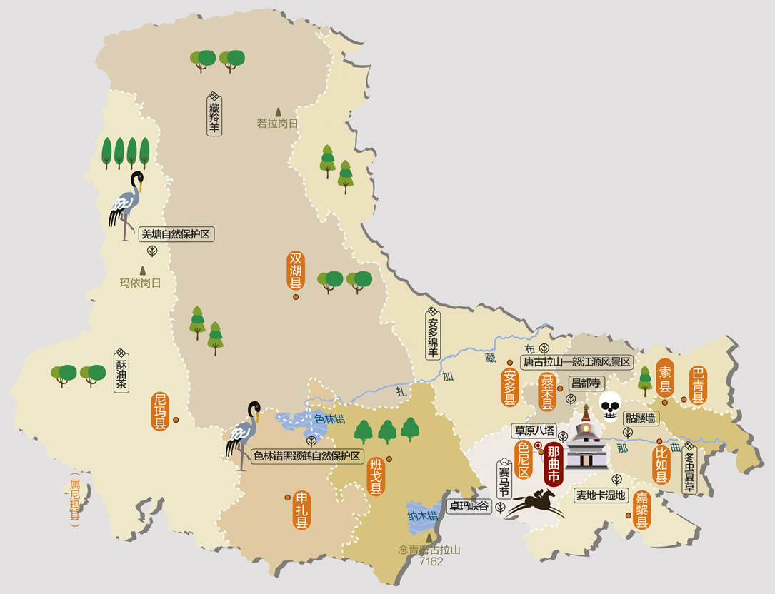 “那曲”因境內(nèi)那曲河(怒江上游)而得名,舊譯“黑河”,明末清初和碩特蒙古稱喀喇烏蘇,清代作哈拉烏蘇、喀拉烏蘇,為“那曲”這一藏語(yǔ)地名的滿語(yǔ)義譯。2017年10月,撤銷那曲地區(qū),設(shè)立地級(jí)那曲市。那曲市地理位置特殊,是西藏的“北大門(mén)”,市內(nèi)青藏鐵路、青藏公路、格拉輸油管線、蘭西拉光纜、青藏直流聯(lián)網(wǎng)等西藏的“生命線”,均貫穿那曲500多千米。境內(nèi)有國(guó)家級(jí)名勝風(fēng)景區(qū)納木錯(cuò)—念青唐古拉山、薩普冰川、國(guó)家級(jí)自然保護(hù)區(qū)麥迪卡濕地等自然風(fēng)光。是長(zhǎng)江、怒江、瀾滄江等大江大河的發(fā)源地,素有“江河源”“中華水塔”的美譽(yù)。