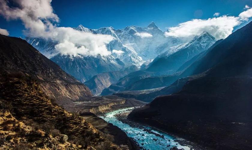 雅魯藏布江大峽谷兩側(cè),壁立高聳的南迦巴瓦峰(海拔7782米)和加拉白壘峰(海拔7234米),其山峰皆為強(qiáng)烈上升斷塊,巍峨挺拔,直入云端。峰嶺上冰川懸垂,云霧繚繞,氣象萬(wàn)千。