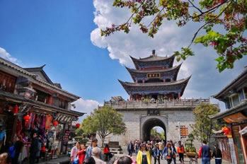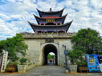 南城樓稱雙鶴樓又稱承恩樓。南城門是古城四門之首,始建于明洪武十五年(1382年),為古城最古老雄偉的建筑,是大理古城的象征和標志。古城墻四面各長約1500米、高6米、厚達12米。城門上“大理”二字是郭沫若1961年游覽大理時親筆所提,“大理”是國號,意為“大治大理,富國興邦”之意。
