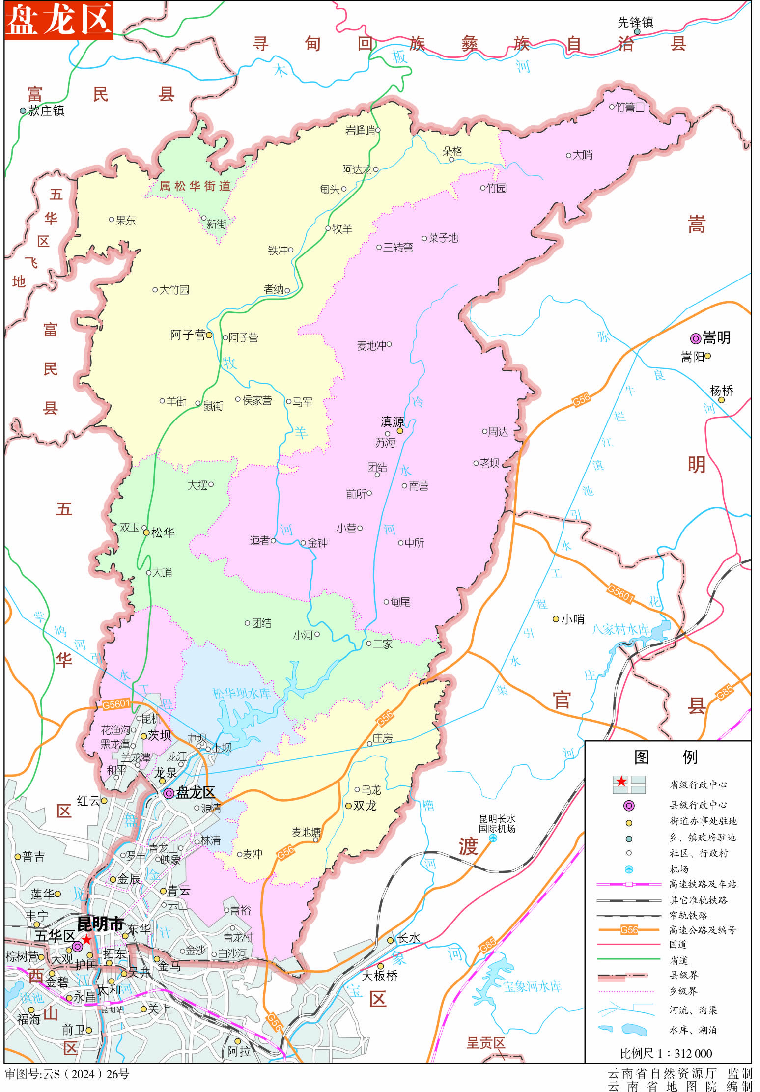 盤龍區(qū),隸屬于云南省昆明市,昆明五個(gè)主城區(qū)之一,位于昆明主城區(qū)東北部,東、南面與官渡區(qū)相連,北接嵩明縣和富民縣,西臨五華區(qū),西南與西山區(qū)接壤,轄區(qū)面積861.04平方千米,主城建成區(qū)面積60.96平方千米。 盤龍區(qū)轄拓東、鼓樓、東華、聯(lián)盟、金辰、青云、龍泉、茨壩、松華、雙龍、滇源和阿子營(yíng)12個(gè)街道辦事處,共71個(gè)城市社區(qū)、32個(gè)村委會(huì)。盤龍區(qū)常住人口為101.27萬(wàn)人。