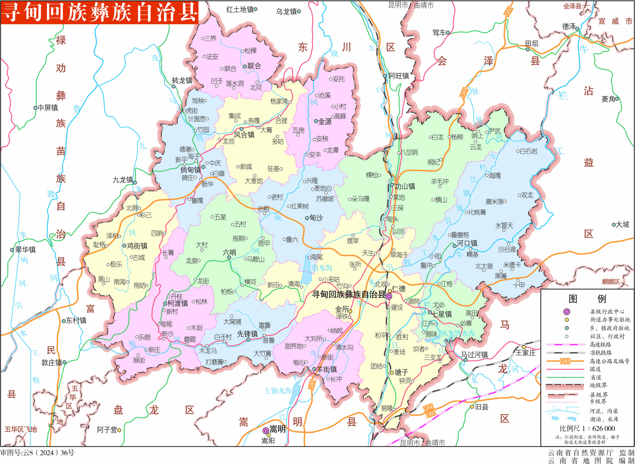 鎮(zhèn):羊街鎮(zhèn)、倘甸鎮(zhèn)、柯渡鎮(zhèn)、功山鎮(zhèn)、七星鎮(zhèn)、河口鎮(zhèn)、先鋒鎮(zhèn)、雞街鎮(zhèn)、鳳合鎮(zhèn)