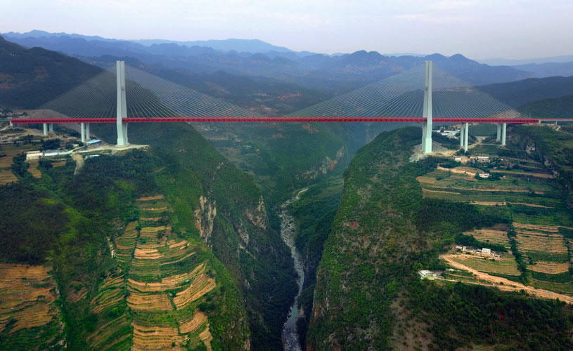 北盤江第一橋地處云南省宣威市普立鄉(xiāng)臘龍村與貴州省六盤水市水城縣都格鄉(xiāng)交界處,位于云南省宣威市普立鄉(xiāng)尼珠河,是杭瑞高速公路控制性橋梁工程,坐落于滇東北的崇山峻嶺中,大橋全長1341.4米,主跨720米,為世界最大跨徑的鋼桁架梁斜拉橋。