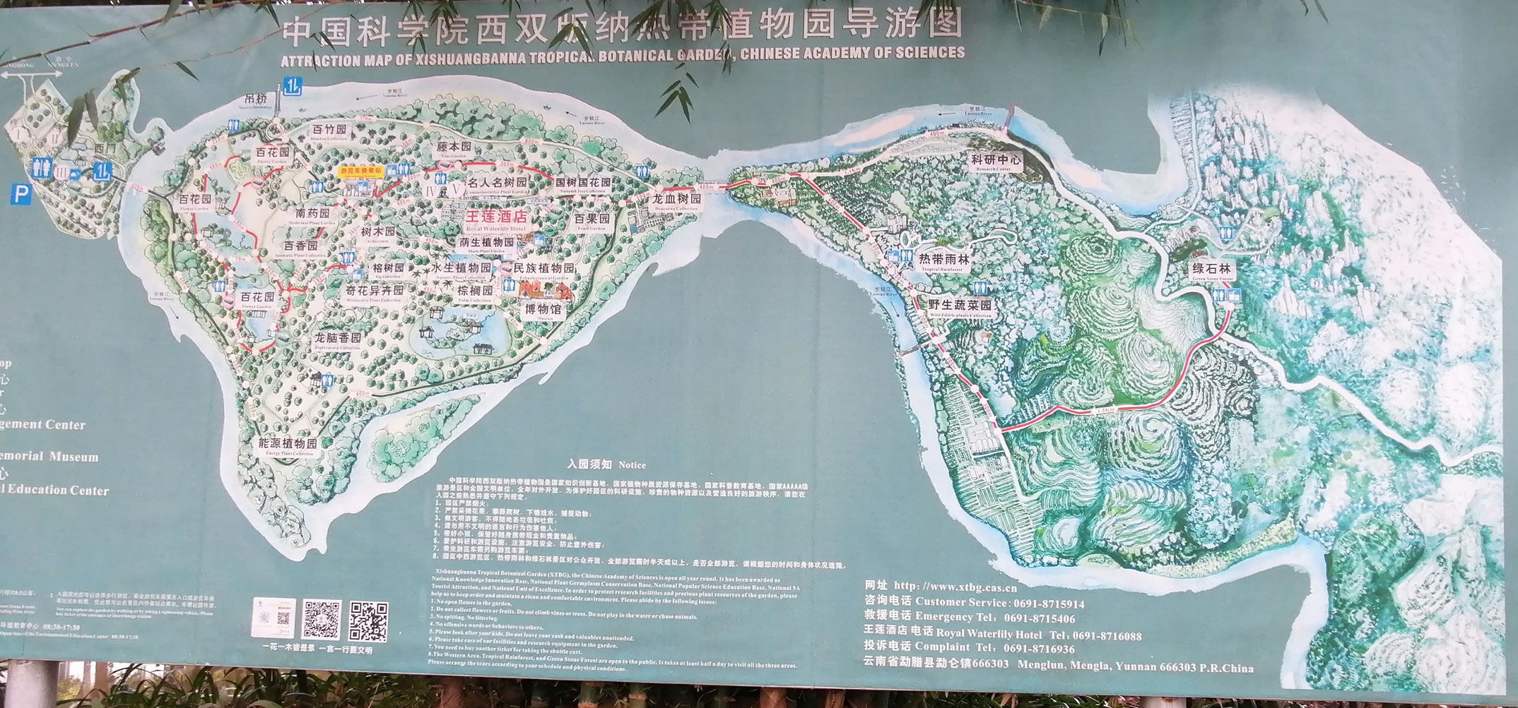 截至2015年9月,在占地面積約為11.25km2中國科學(xué)院西雙版納熱帶植物園里,收集有活植物12000多種,建有38個植物專類區(qū),還保存有一片面積約250hm2的原始熱帶雨林。